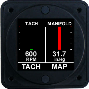 - Simultaneous, real-time analog data depiction and digital value display for both manifold pressure and tachometer.