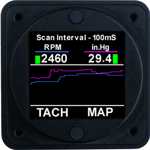 - Simultaneous, real-time analog data depiction and digital value display for both manifold pressure and tachometer.